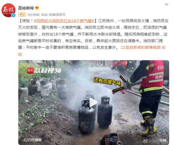 江苏扬州,一处民房突发火情,消防员在救活时发现,屋内竟有一大堆燃气罐。消防员当即冲进火场,肩挑手扛,把滚烫的气罐转移到室外,共拎出18个燃气罐,并不断用水冲刷冷却降温。随后民房租客赶到称,这些燃气罐都是平常搜集的,有空有实。现在,详细起火原因还在查询中。消防部分提示:平常家中必定别堆积易燃易爆物品,避免发生意外。