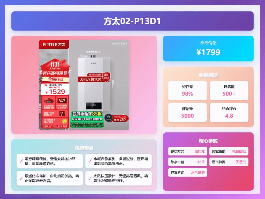 这款方太燃气热水器,亮点可真不少!它采用了水量伺服器和AI智能感控温技术,据说能把水温波动精准控制在±0.5℃,也就是说,告别洗澡忽冷忽热的烦恼啦!而且,它还特别安静,用了多维柔声系统,运行噪音才40dB,希望真的像有些朋友说的那样“声音很小”,洗澡也能享受静谧。